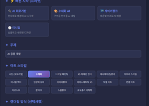 📜 히스토리 (최근 생성 기록) 생성한 모든 프롬프트를 자동으로 저장 (최대 50개) 시간 표시 (방금 전, 5분 전, 2시간 전 등) 중복 프롬프트는 자동으로 필터링 클릭하여 재사용 - 프롬프트를 클릭하면 결과 창에 표시 개별 삭제 및 전체 삭제 기능 ⭐ 즐겨찾기 마음에 드는 프롬프트를 즐겨찾기로 저장 히스토리에서 별(☆) 버튼으로 즐겨찾기 추가/제거 즐겨찾기한 프롬프트는 별이 채워짐(⭐) 영구 보관 (50개 제한 없음) 🎯 각 항목마다 제공되는 기능: 클릭하여 사용 - 프롬프트 텍스트 클릭 시 재사용 📋 복사 버튼 - 클릭 한 번으로 클립보드 복사 + 토스트 알림 ⭐ 즐겨찾기 - 히스토리에서 즐겨찾기 토글 🗑️ 삭제 - 개별 항목 삭제 💾 저장 방식: 로컬스토리지 사용 - 브라우저에만 저장, 회원가입 불필요 자동 저장 - 프롬프트 생성 시 자동으로 히스토리에 추가 데이터 지속성 - 브라우저를 닫아도 데이터 유지 🎨 UI/UX 개선: 양쪽 2열 레이아웃 (모바일에서는 1열) 최대 높이 400px, 스크롤 가능 커스텀 스크롤바 디자인 호버 효과와 부드러운 애니메이션 카운트 뱃지로 개수 표시 이제 생성한 프롬프트를 잃어버릴 걱정이 없고, 자주 쓰는 프롬프트는 즐겨찾기로 관리할 수 있습니다! 😊✨